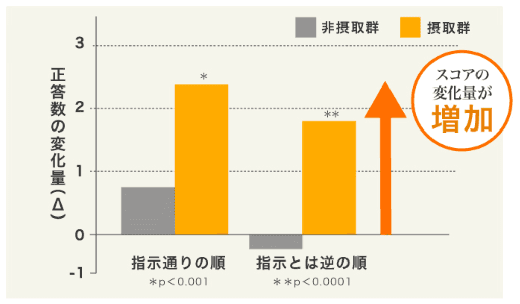 出典:Pharmacopsychiatry.2003;36(4):127-133.Fig3Aを改変対象者:健常なブラジル人中高年男性48名を、イチョウ葉エキス80mg(イチョウ葉由来フラボノイド配糖体19.2mg及びイチョウ葉由来テルペンラクトン4.8mg含有)を含むカプセルを摂取する群(摂取群)と、イチョウ葉エキスを含まないカプセルを摂取する群(非摂取群)に分けた。試験結果:8ヶ月間摂取した結果、摂取群では記憶カテスト(位置や順番を記憶するテスト)スコアの変化量が有意に増加した。データ選択理由:研究レビューの採用文献のうち代表的な一例 ※本製品を用いた臨床試験ではありません。※1.イチョウ葉由来フラボノイド配糖体及びイチョウ葉由来テルペンラクトン ※2.Corsiブロックテストを用いた記憶力テストで得点の増加を確認